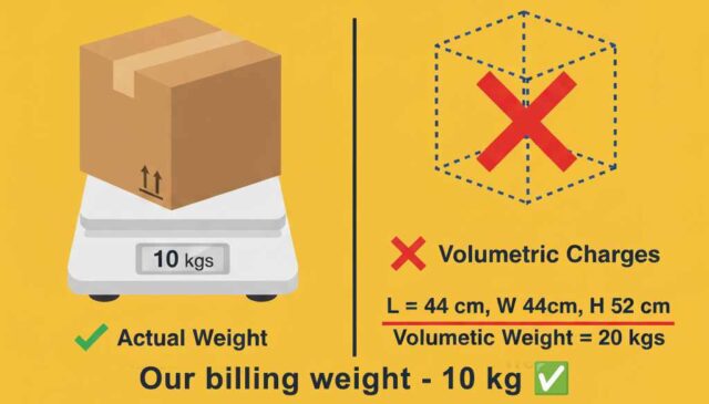 No volumetric weight charges — you pay only for the actual weight of your shipment.